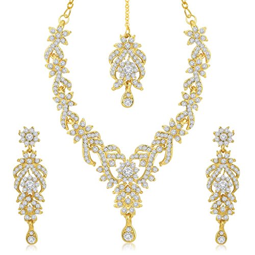 Sukkhi Gold Plated Australian Diamond Choker Necklace With Drop Earrings And Mangtikka Set or Women